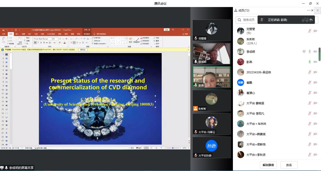 “育晶论坛”成功举办,北京科技大学教授、博士生导师李成明受邀作题为“CVD金刚石的制备和应用”的报告。论坛由大平台副教授彭燕主持。