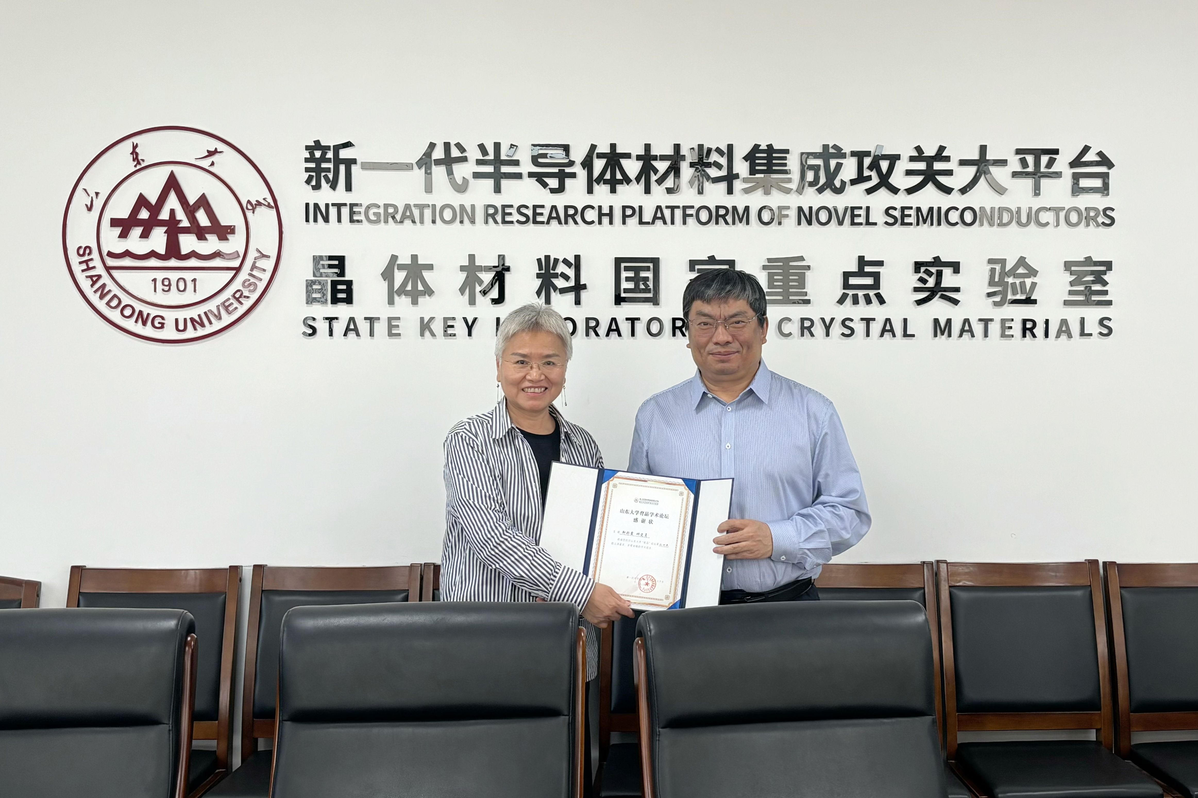 报告期间,靳博士和现场师生围绕新型涂层制备技术、反应过程机理、涂层寿命、产品成本等方面进行了讨论。此后,徐现刚教授向靳彩霞博士表示感谢并颁发证书。