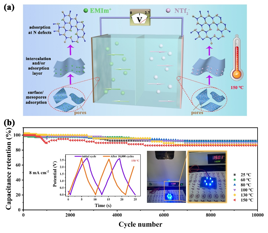 电化学能源存储是解决化石燃料能源危机和环境污染的有效策略。新型储能器件超级电容器,因其寿命周期长、能量存储快、功率输出大而引起了人们的广泛关注。然而,受限于电极材料和电解液在极端高温环境中结构不稳定,导致常规电池和超级电容器件不能正常工作。因此,开发在极端环境下,安全且高性能的耐高温超级电容器面临着巨大的挑战。