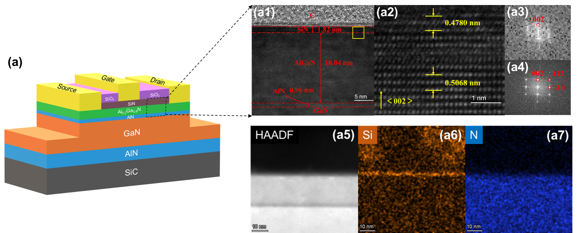 栅介质层是场效应晶体管的重要组成部分,常规栅介质层以氧化物或氮化物非晶材料为主,这导致非晶介质层和单晶半导体之间很难形成原子层级的平坦界面,从而产生大量的界面电荷,对器件的关态漏电、输出电流、击穿电压和可靠性等产生巨大影响。由于栅介质层和沟道半导体材料之间大的晶格失配和热失配,使得栅介质层的单晶生长成为一直以来的难题。针对该问题,团队利用原位生长技术,首次在AlGaN势垒层上生长出2nm晶态SiN帽层,实现了GaN器件上单晶介质层生长技术的突破。通过HRTEM、XPS等多种表征手段确定所生长的SiN晶体结构为缺陷纤锌矿结构(DW-SiN),其与AlGaN具有更加优异的界面质量,有效地将界面态密度降低1个数量级。与传统器件相比,具有晶态SiN帽层的GaN器件表现出更高的电子迁移率(1552cm2/V∙s,提高21%)、更大的输出电流(493 mA/mm,提高41%)、更大的开关电流比(7.29×106,提高1个量级)以及更高的跨导(152 mS/mm,提高38%)。得益于优异的界面特性和单晶质量,该SiN单晶生长技术有效地抑制了器件中的尖峰电场分布,成功地将GaN器件的击穿电压从625V提升到810V,实现了30%的提高。此外,SiN采用原位生长,可省略器件制备中的介质层沉积工艺,从而简化工艺流程,节约生产成本。这种晶态SiN介质层生长技术,显著提高了器件的输出电流和击穿电压,降低了器件的生产成本,在GaN功率开关和高功率微波等领域具有重要的应用潜力。