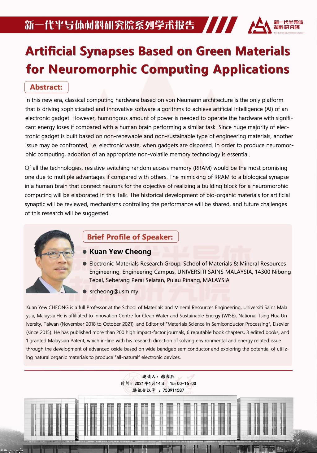 Huge demand of electronic gadgets with different form factors and applications has been driven by the needs of Internet of Things (IoT) with intelligent gadgets artificially created based on both hard and software. This is the catalyst for industrial revolution 4.0 to be spearheading. In this new era, classical computing hardware based on von Neumann architecture is the only platform that is driving sophisticated and innovative software algorithms to achieve artificial intelligence (AI) of an electronic gadget. However, humongous amount of power is needed to operate the hardware with significant energy loses if compared with a human brain performing a similar task. Since huge majority of electronic gadget is built based on non-renewable and non-sustainable type of engineering materials, another issue may be confronted, i.e. electronic waste, when gadgets are disposed. Even though their development of IoT and AI provide significant advantages to mankind by enhancing connectivity, security, comfortability, productivity, etc., energy waste and electronic waste must be seriously considered during the design stage of those gadgets. One of the strategies to simultaneously overcome these two issues is by replacing energy wastage of von Neumann based architecture in hardware computing with more energy efficient brain-like (neuromorphic) computing and replacing non-sustainable type of engineering materials to produce the hardware with bio-organic based materials that can be derived from plants, living, or once living things. In order to produce neuromorphic computing, adoption of an appropriate non-volatile memory technology is essential. Of all the technologies, resistive switching random access memory (RRAM) would be the most promising one due to multiple advantages if compared with others. The mimicking of RRAM to a biological synapse in a human brain that connect neurons for the objective of realizing a building block for a neuromorphic computing will be elaborated in this Talk. The historical development of bio-organic materials for artificial synaptic will be reviewed, mechanisms controlling the performance will be shared, and future challenges of this research will be suggested.