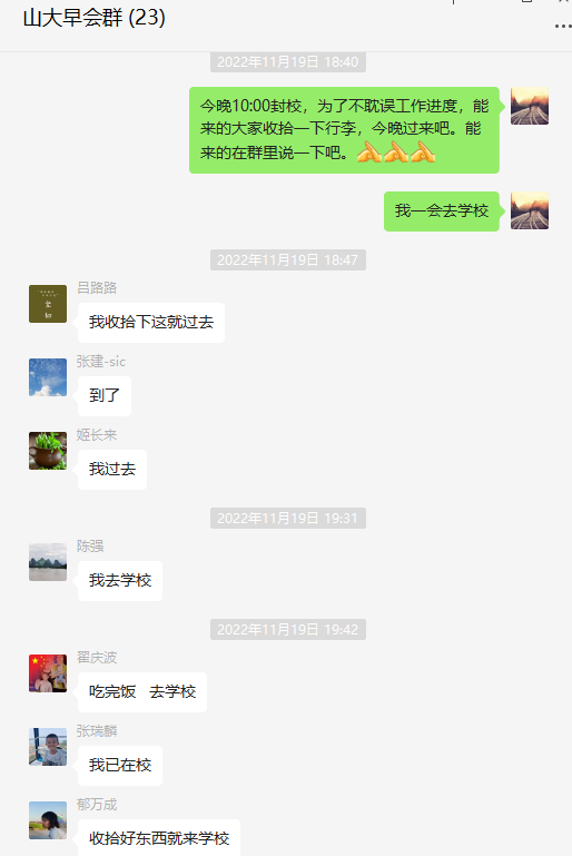 2022年已离我们悄然而去,在2023年春节即将到来之际,回顾2022年感悟颇多。2022年注定是不平常的一年,这一年我们是团队承担国家“揭榜挂帅”项目实施的第一年,团队成员都憋着一股劲尽自己最大的力量加快项目研发进度。然而2022年也是新冠疫情防控不断反弹的一年,特别是在进入11月份新冠疫情在济南呈现出了局部地区“零星散发”向“死灰复燃”的迹象。学校为了更好的控制疫情,决定11月19日晚上10点钟进行封校。接到通知后,我按照惯例在团队的工作群里告诉团队其他成员学校临时封校的通知,大家收到通知后都“舍小家顾大家”,在短时间内积极报名选择留守团队开展工作。