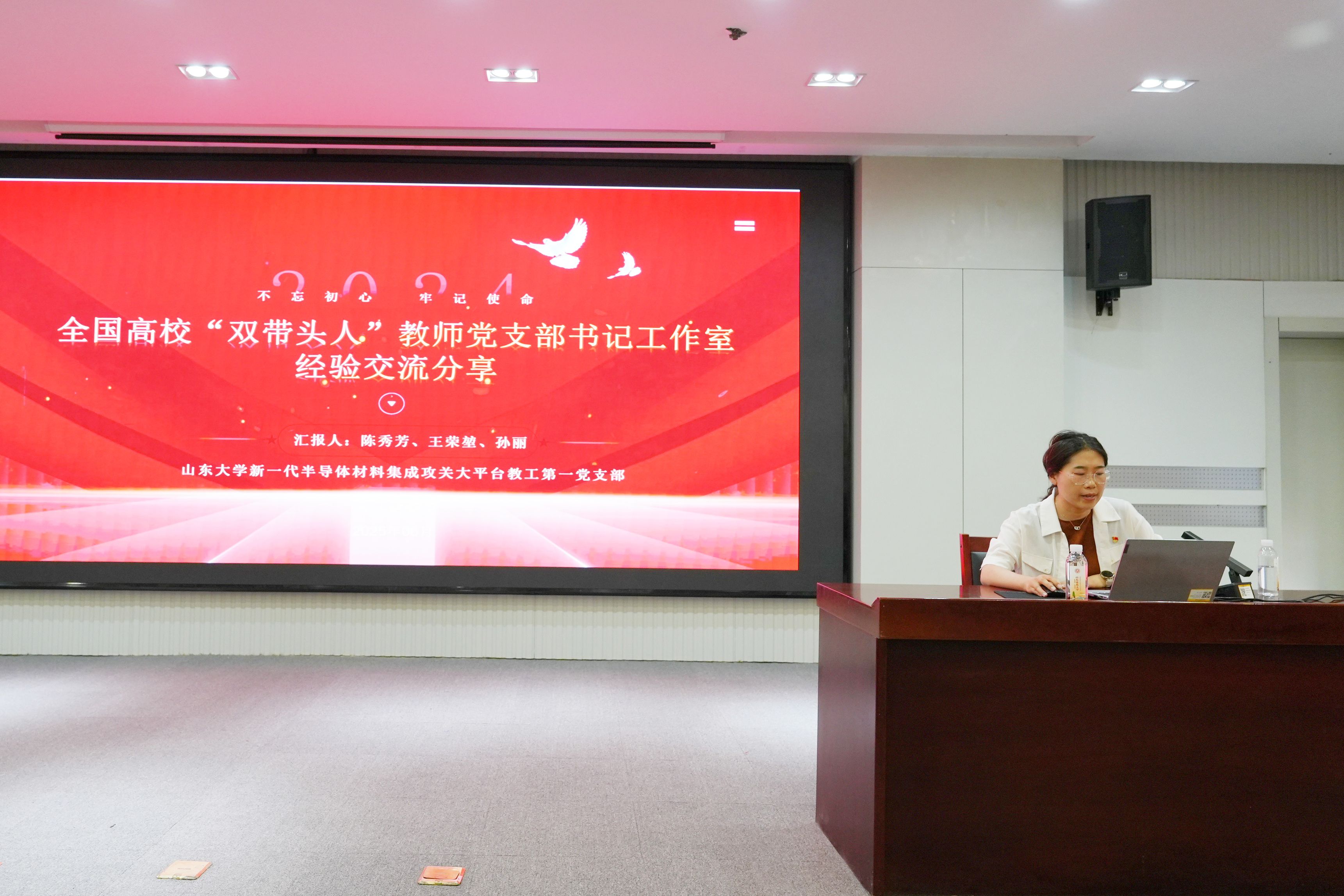教工第一党支部党员孙丽代表支部,分享了全国高校“双带头人”教师党支部书记工作室的建设及申报经验。第一党支部在团队带头人徐现刚教授和支部书记陈秀芳教授的带领下,以重大科研任务为纽带,切实将组织生活嵌入科研攻关链条。陈秀芳书记始终坚持“业务做到哪里,党的工作就延伸到哪里”的原则,在中试基地创新性地建立了“先锋攻关团队临时党支部”,充分激发了支部党员在碳化硅衬底及器件领域“卡脖子”技术攻关过程中的先锋模范作用。通过分享第一党支部党建引领科研攻关的典型案例,以及对全国高校“双带头人”教师党支部工作室申报书的深入解析,力求为省内高校提供可复制、可推广的组织范式。
